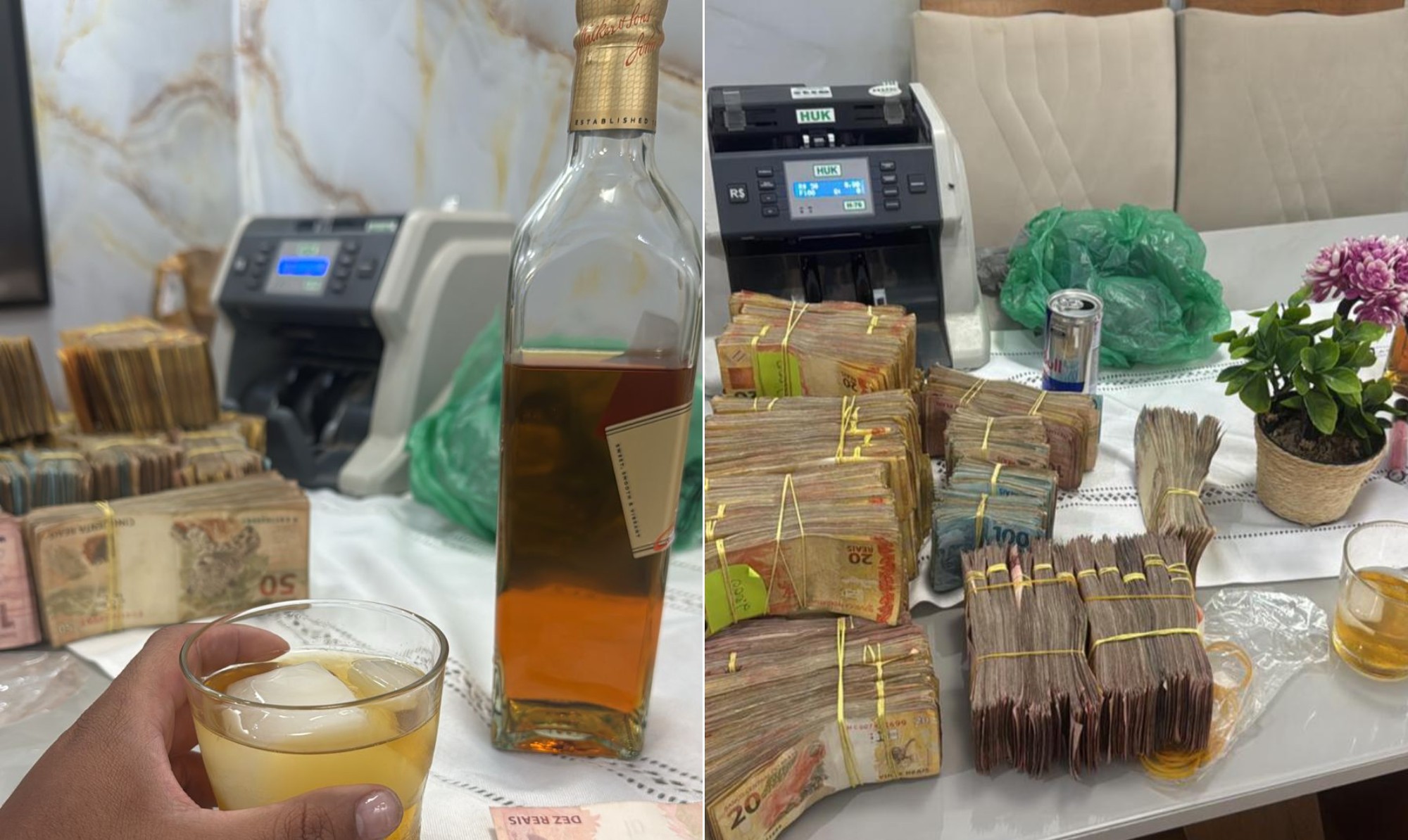 Apesar de dinheiro não ter sido encontrado no local, nesta segunda-fera, imagens anexadas a uma investigação da Desarme dão uma ideia das quantias movimentadas no imóvel. Numa delas, nada menos que 11 maços de notas, de R$ 100, R$ 50 e R$ 20, estão posicionadas em uma mesa ao lado de uma máquina de contar dinheiro e de um copo com uma bebida que parece ser uísque. Em outra, uma garrafa aparentando ser da mesma bebida também é vista ao lado de amarrados de maços de cédulas diversas. Segundo a polícia, os celulares e o notebook apreendidos serão analisados e periciados. O objetivo é o de recolher mais pistas que ajudem a identificar integrantes do grupo criminoso. Uma mulher, de 35 anos, que seria do Estado do Amazonas, foi presa no prédio, durante a ação da Desarme. Segundo os investigadores, ela seria suspeita de ser a responsável pela contabilidade do bando, além de servir como uma espécie de elo do CV com o tráfico do Norte do país.